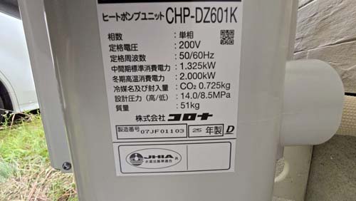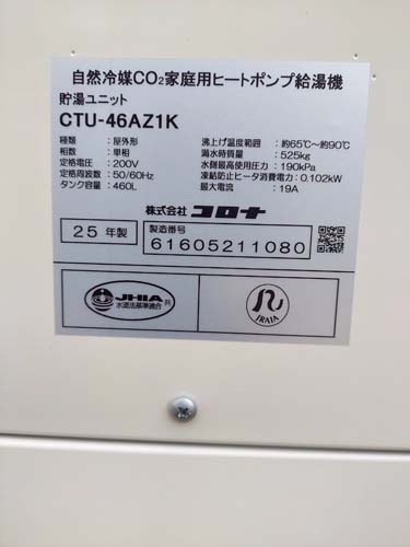 草津市野路 コロナ自然冷媒CO2家庭用ヒートポンプ給湯機 ヒートポンプユニットCHP-DZ601K、貯湯ユニットCTU-46AZ1K エコキュート交換工事|滋賀エコキュート取り付け工事センター